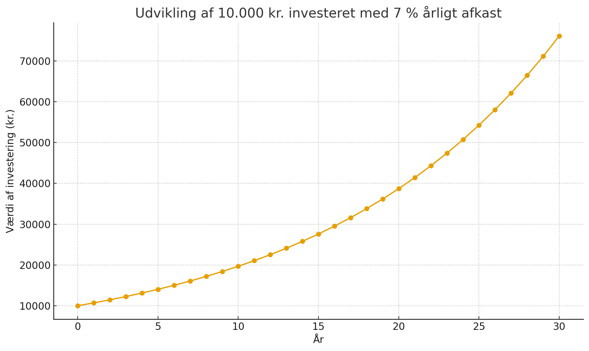 Hvis du investerer 10.000 kroner og får et årligt afkast på 7 %, har du efter ét år 10.700 kroner. Efter andet år får du ikke kun 7 % af 10.000, men af 10.700 – og sådan fortsætter det. Jo længere tid du lader pengene stå og vokse, jo hurtigere stiger værdien.